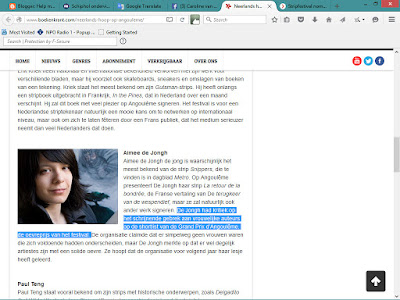 De posts van Hans de afgelopen dagen laten er geen twijfel over bestaan: wie deze week nog graag een tekening met handtekening, in het Frans: dedicase, van Hans in zijn of haar album wil hebben, zal daar ver voor moeten reizen. Hans, alias Vano, signeert deze week namelijk op het 43ste Festival de la Bande Dessinee d'Angouleme dat van donderdag 28 januari tot en met zondag 31 januari 2016 in Angouleme wordt gehouden. Hans is op donderdag, vrijdag en zaterdag te vinden in de stand van uitgeverij BD Must, stand H12 in Espace Para-BD. Daar zal ook de gloednieuwe Franstalige Rhonda 2: Rebecca te verkrijgen zijn, net als de Franse kleureneditie van Rhonda 1: Help me, Rhonda! En natuurlijk zal Hans die albums graag van een 'dedicase' voorzien voor iedereen die dat maar wil. En tijd voor een praatje in het Frans, Engels, Vlaams of Nederlands is er natuurlijk ook. Kortom, voor Rhonda is Angoulême deze week the place to be. Mis het niet.